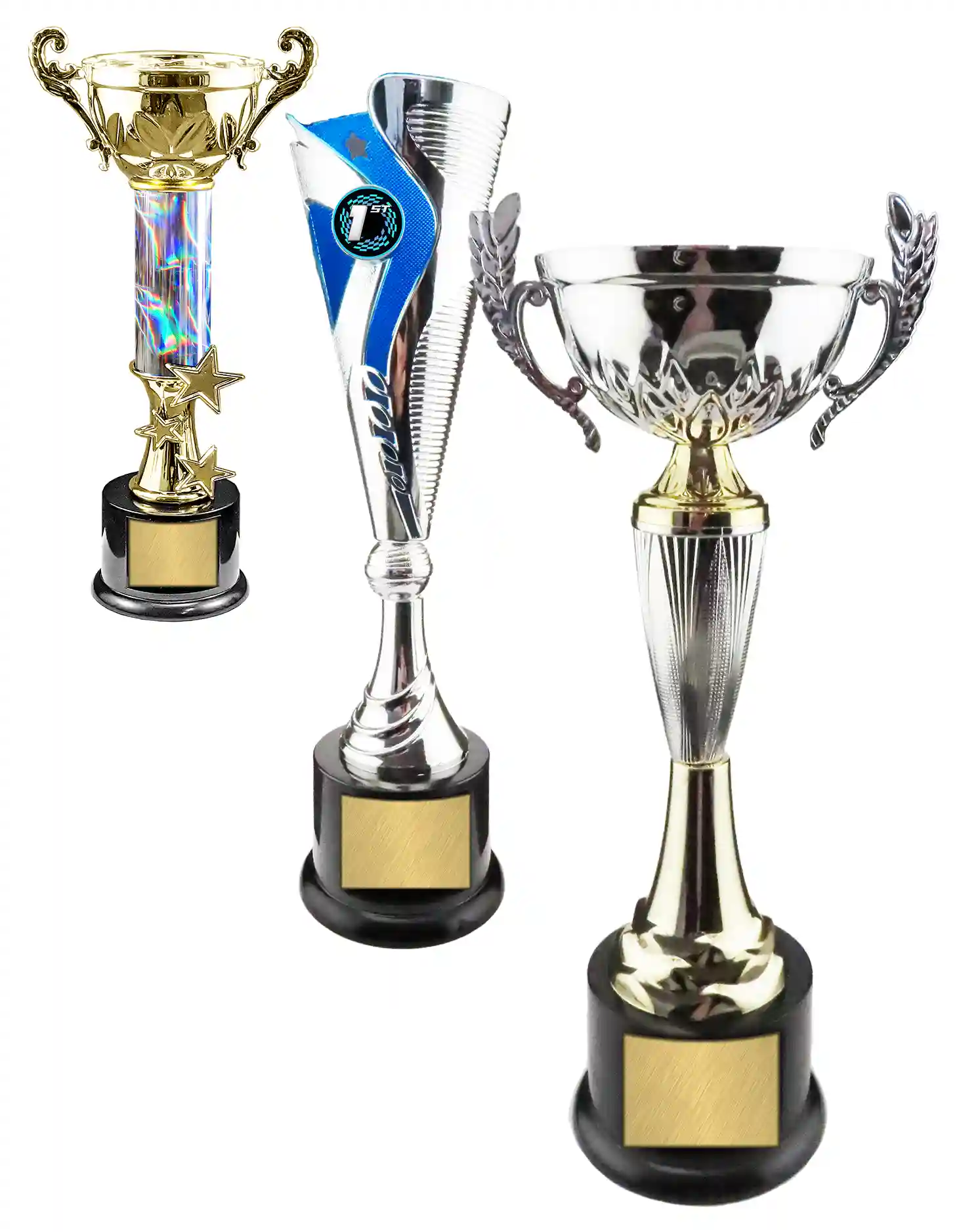 We stock soccer trophy cups in a wide range of heights, from small recognition cups to oversized gold championship designs.