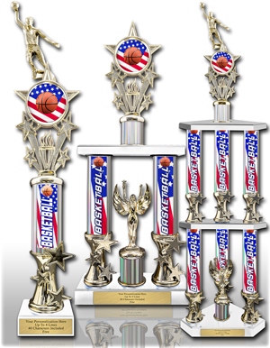 USA-made basketball trophies—free shipping, no engraving fees, fast lead times, expedited options, drop shipping, and bulk discounts from Trophy Deals.