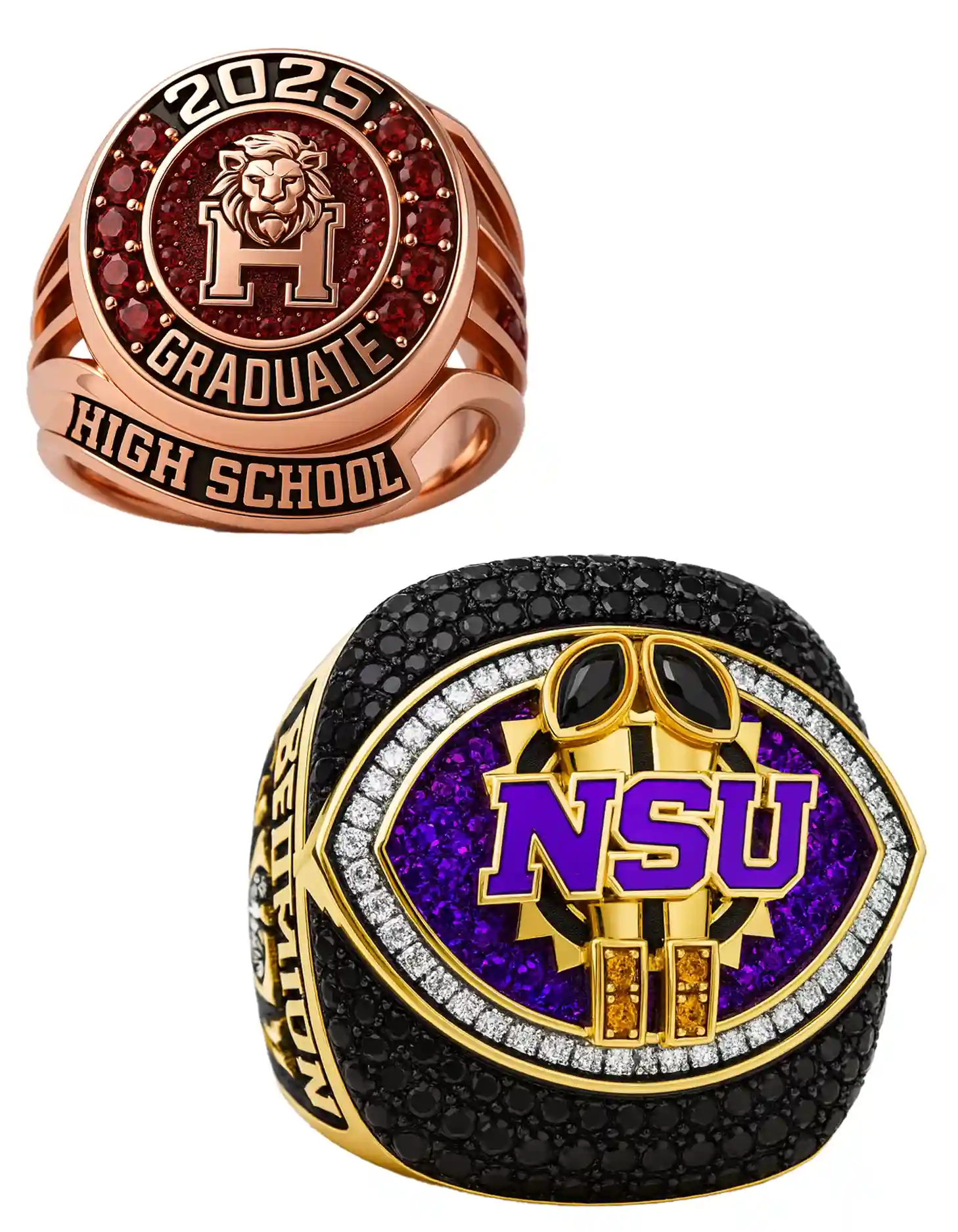 Shop championship rings: custom sports, trophy, replica, and youth state rings. Football, baseball, basketball, soccer & softball—engraved fast.
