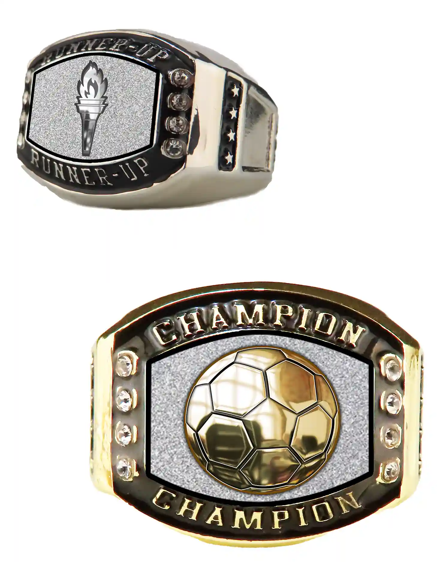 Soccer: Badge-style faces and vertical stripes make standout soccer rings for club and state titles.